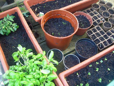 Almost of all of the seeds have sprouted and most of them have now been repotted in larger spaces. We've also cheated a little and purchased both a tomato plant and a basil plant.