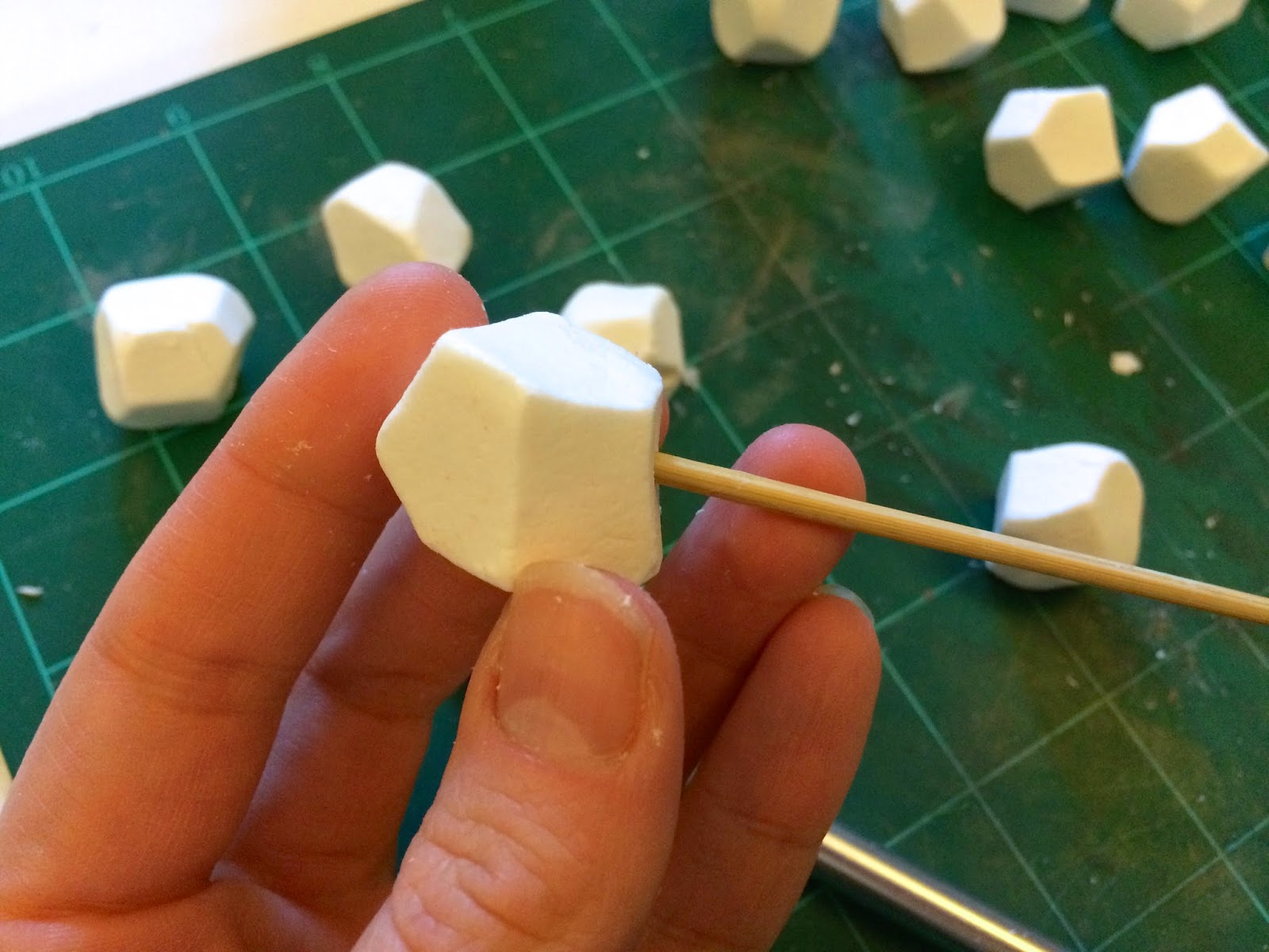 With your craft knife slice a straight edge down one side of the ball. Then working from that flat edge another at a slightly different angle, then another. Keep going until your entire bead is made up of flat edges.