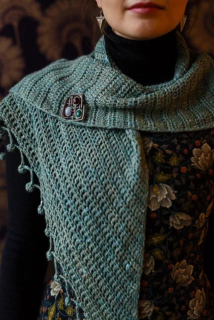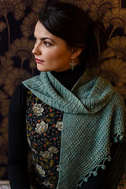 Crocheted in a DK yarn with a tweedy look, this shawl is super soft and finished with a fun pom-pom edging.
