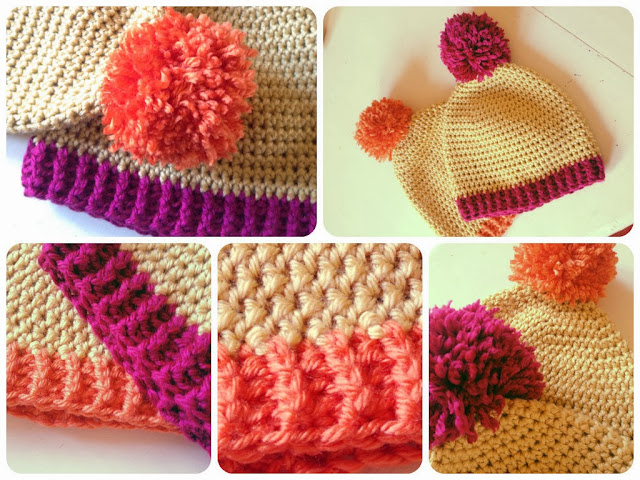 I made the pattern up as I went along, working top down in half treble stitch (possibly my favourite of the crochet stitches!) I worked in continuous rounds and then added a contrasting band of treble crochet as ribbing along the bottom.  And of course a pom pom on top!