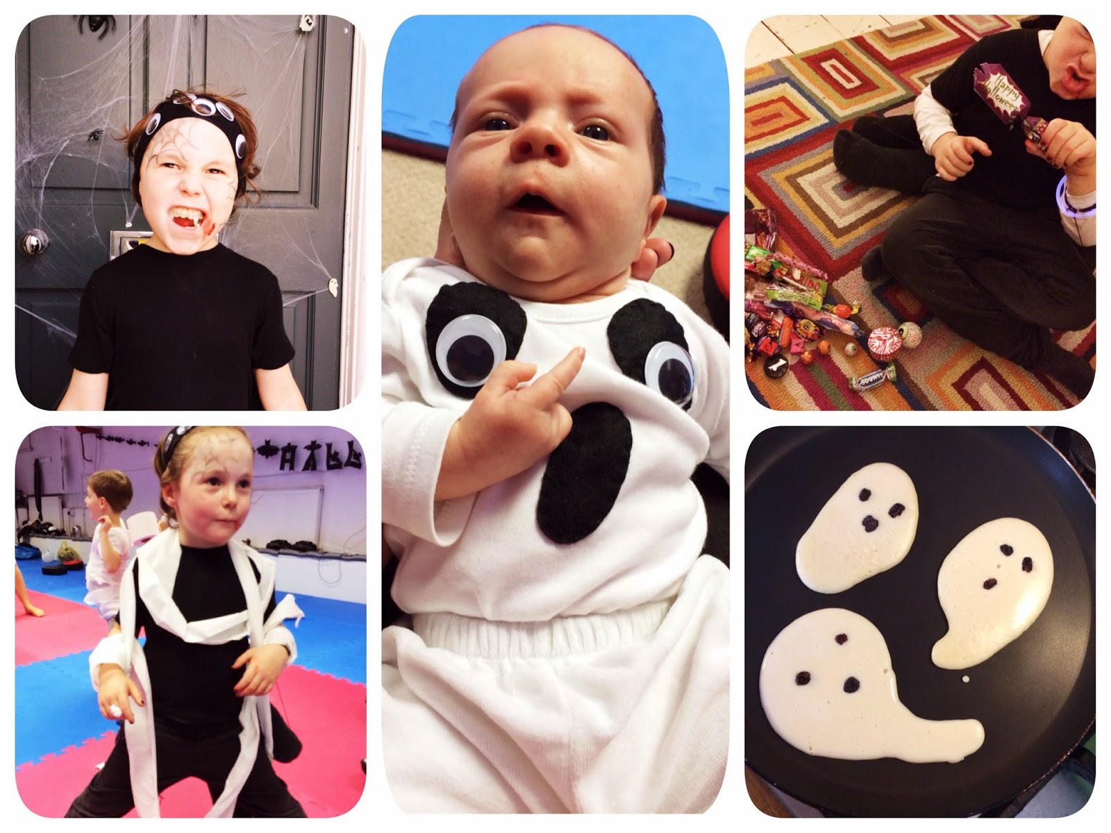 Milo had his best friend stay over on Thursday night for the first time. He's been to others for sleepovers but never had one here before so as you can imagine there was much excitement and not much sleeping. Friday morning I prepared ghostly pancakes for the sleep deprived monsters! I thought they were fab (super simple too, I just made a ghostly shape with the batter and added currants for the eyes and mouth). Cries of 'errr what's the black stuff' were shouted in unison when they were presented and then they both proceeded to remove the eyes and mouths, but it's the thought that counts right?!